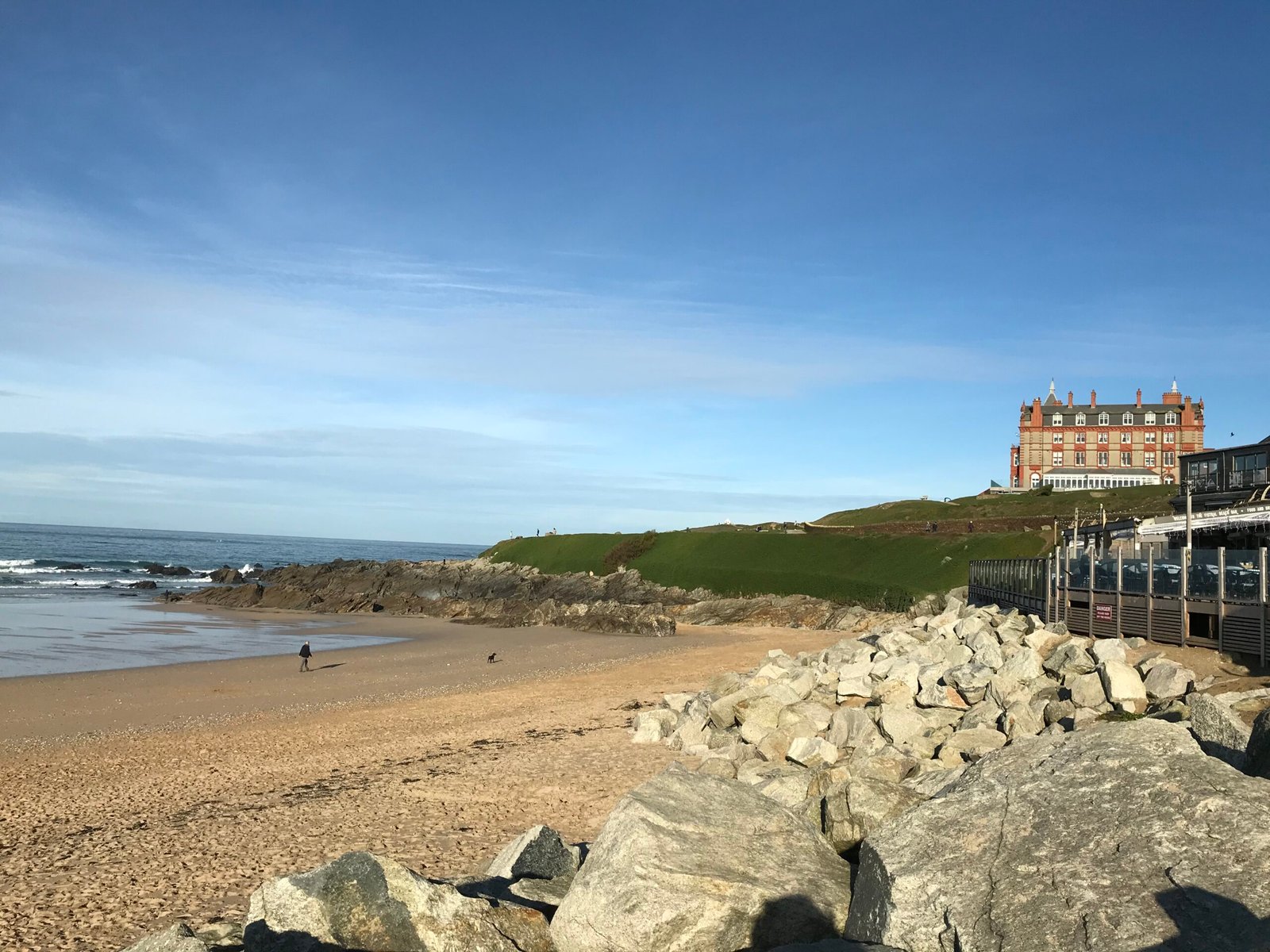 The Fistral Beach car park is right by the beach and there is fairly level access to the rear of the beach and the restaurants and shops as you enter although the beach slopes downwards.